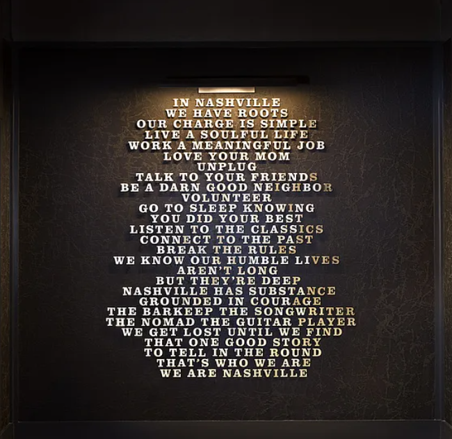 Nashville has deep roots and the people there connect to Nashville’s past (which you’ll read about in the next section), it promotes following your dream so you can “work a meaningful job”, people here strive to be a “darn good neighbor” (little country twang there), it’s always humble, and around every corner, there’s a story to be told.