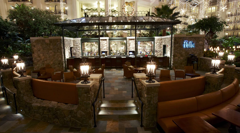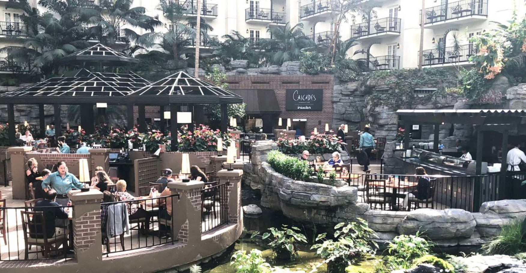 The Cascades is the atrium you’ll be looking into when you’re in the hotel lobby. There is a waterfall, live plants all around, sidewalks, and two restaurants to eat at. On one side is a restaurant, The Falls, that serves alcohol, soda, and little snacks like Chex Mix and BBQ chips. On the other side is a restaurant buffet, Cascades American Buffet, that serves breakfast, lunch, and dinner. There’s also a sushi bar.